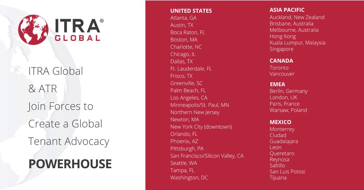 ATLANTA, GA. — May 9, 2024. International Tenant Representative Alliance (“ITRA Global”) and Alliance of Tenant Representatives (“ATR”) are thrilled to announce their merger to form one of the world’s largest and most influential organizations providing conflict-free representation to tenants and occupiers of commercial real estate. The organization will operate under the ITRA Global brand and has over 50 member firm locations worldwide.